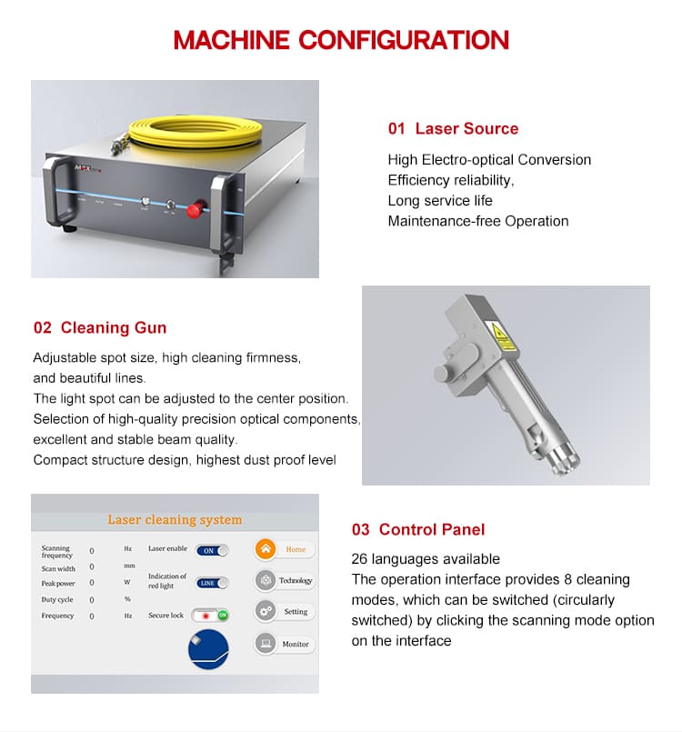 Som en beröringsfri laserrengöringsmaskin skadar den inte delarnas substrat, inga förbrukningsvaror energibesparing och miljöskydd, och den kan effektivt avlägsna harts, olja, fläckar, smuts/rost, beläggning, beklädnad och färg från arbetsstyckets yta för att möta rengöringskraven på komplex modellering och finpositionering inom industribearbetningsområdet, uppnå en högre renhetsgrad av rengöringseffekt till en lägre kostnad och kostnaden för produktionen.